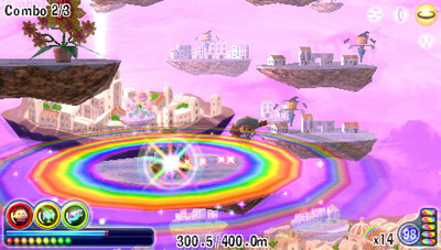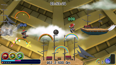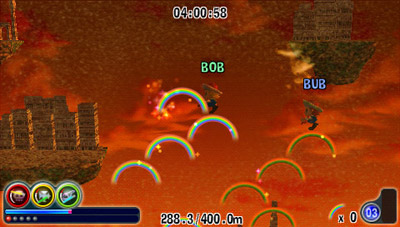 Now the biggy, the new game play elements. There is a key rule in remakes. Don’t mess with the core gameplay, enhance it! Well Evolution seems to have ignored this. As mentioned there is now the ability to only throw 6 rainbows. This can be upgraded, but from the start this is a pain. You can have 6 rainbows out in no time and just be left stranded for several seconds whilst you wait for the first ones to disappear and let you make more! Admittedly the new strength of the rainbows, is helpful. It prevents you destroying your rainbows accidentally by jumping on them.