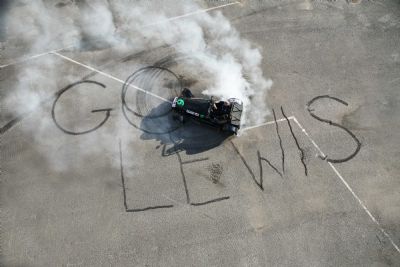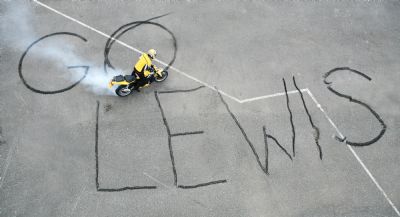 As these pictures show, the message was created entirely by the skid marks of a sports car and a motorbike, using blistering wheelspins and breakneck handbrake turns to lay rubber onto the tarmac to produce the words ‘Go Lewis!’ in giant 50-foot lettering.