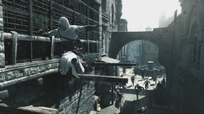 Next thing is the amazing gameplay, once inside the game, you’ll find that you can go pretty much anywhere! The cities are vast in size and filled with areas to explore. To do this, you also have superb maneuverability, you can run and climb and walls, walk all over the rooftops, jump between houses, and lots, lots more. This running up walls lark and all these skillful moves could be related to Ubisoft’s past achievement with Prince of Persia, which was also a bloody good game, nice to see that they’ve put a bit of that in it. You have 4 main weapons, your trusty traditional sword, used to mash your way through anyone who takes your fancy, your quick and nifty throwing knives, used to take down enemies from a distance, or your more discreet wrist knife, used to kill people on the sly.