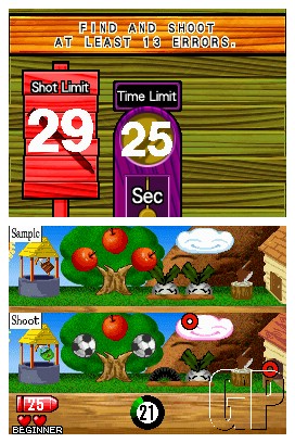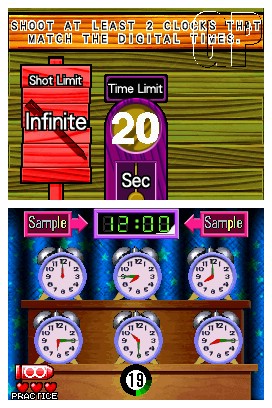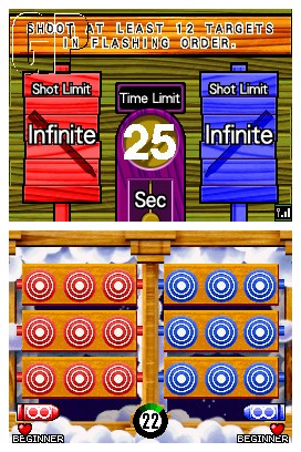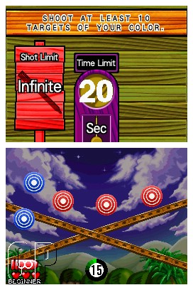 And this is where Point Blank DS begins to slip on the practicalities front. As soon as you start up your DS, everything is handed to you on a brightly coloured platter. There’s nothing to unlock apart from these cringingly unfunny ‘titles’, leaving the player with little rewards to reap and it comes across that the game is just resting on the credit of previous titles. I remember past ports of Point Blank on home consoles came with adventure modes which would try and break up an endless stream of mini-games and gave the main-game much more substance and replay value, whereas with this, it just feels like you’ve been given an anorexic version of a forgotten classic.