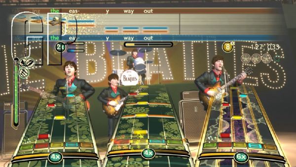 Speaking of all those lyrical linguists out there, The Beatles: Rock Band can cater for up to three singers at any one time thanks to the new ‘Harmonies’ addition. Instead of glossing over the fact that often bands have back-up singers, Harmonix have allowed those with multiple microphones to gather multiple humans together for a melodic sing-song. The singing system practically remains the same as in other Rock Band games, the lyrics scroll across the screen as do corresponding bars for the pitches in which players have to hit in order to score well and avoid embarrassment. The presentation is a lot more clear-cut here in order to make away for 1 or even 2 more pitch bars in correspondence for harmonies if chosen. Despite sounding complicated, the presentation allows group sing-songs easy to read and all can easily find their parts to sing. If players wants to do well, however, a few group practices are needed in order for players to get used to their parts and to truly get a rewarding experience.