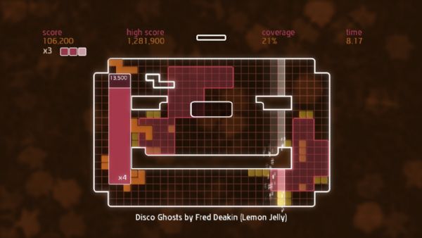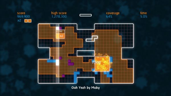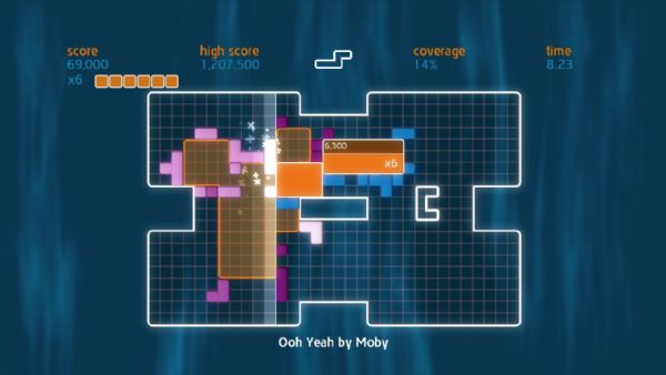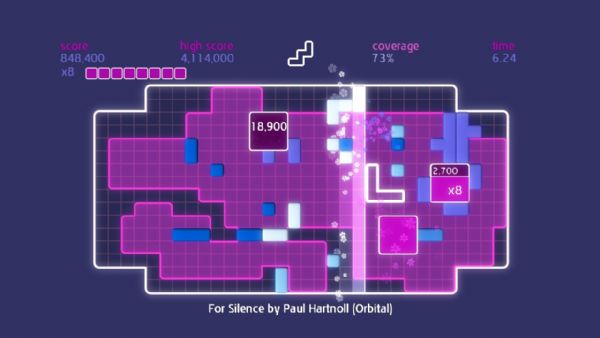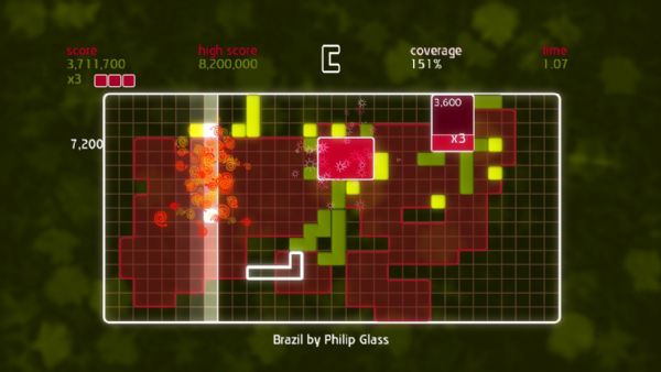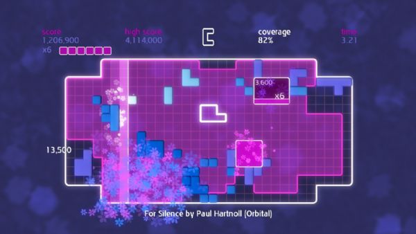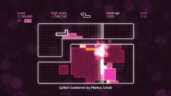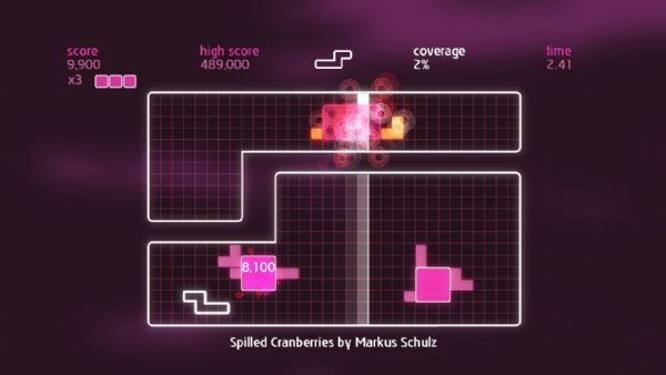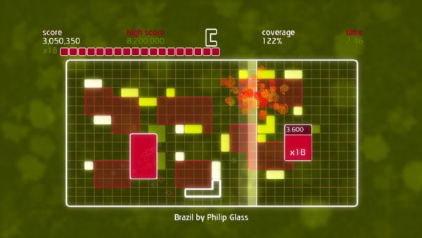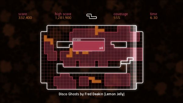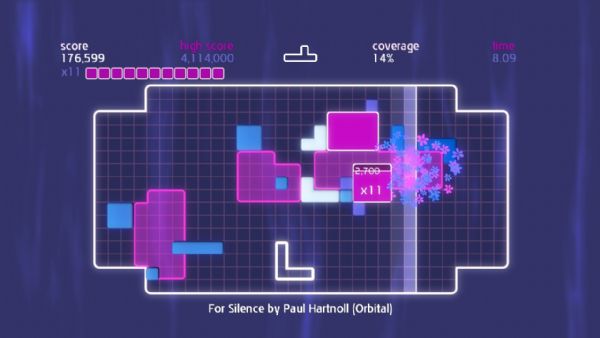 Chime is all about placing shapes on a grid to make music. Gamers control a single shape at a time, and can move, rotate, and then place it on the grid. A beatline moves across the grid in time with the music, and sets off events when it hits placed shapes. Quads are created by placing shapes in solid blocks of 3×3 or more. When a quad is completed and the beat line hits, different musical samples are triggered dependent on its shape. The size of the quad denotes the score, and multipliers can be achieved by having several quads on the screen at once. Once the beatline hits a completed quad, it is stamped down into the grid, earning the player coverage. Put simply, place blocks to create quads, create quads to gain coverage, and gain coverage to fill the grid.