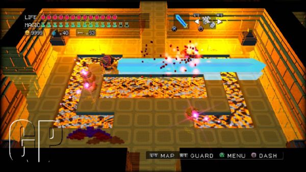 � Customize your hero – When pixels are your building blocks, the possibilities are unlimited. Freely edit the look of your character, or design one completely from scratch, and then trade designs with friends via a compatible USB storage device. Your hero’s blade is also upgradeable, letting you add length and width to create a sword that fills the whole screen!