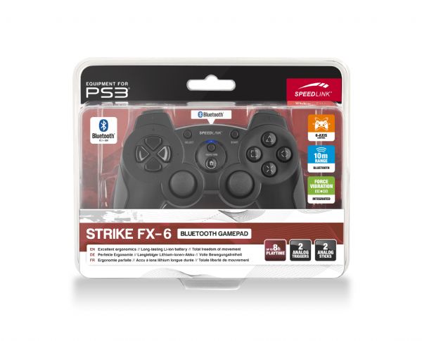 Retaining its classic layout, the STRIKE FX-6 controller for the PS3� and PC combines the legendary precision of the STRIKE series with Bluetooth� technology for up to ten metres of wireless freedom all without requiring an additional receiver. Its ergonomic shape with ultra-grippy, precisely controllable triggers, low weight, and pressure-sensitive buttons together with turbo function deliver maximum gaming comfort and total control, while the vibration feedback function makes it feel as if you’re actually in the game. The integrated Li-Polymer battery offers up to 12 hours of gaming enjoyment and can be charged really easily either via the console using a USB cable or, for the ultimate in convenience, using a SPEEDLINK� charging station like the QUADDOCK All-in-1 Charging System.