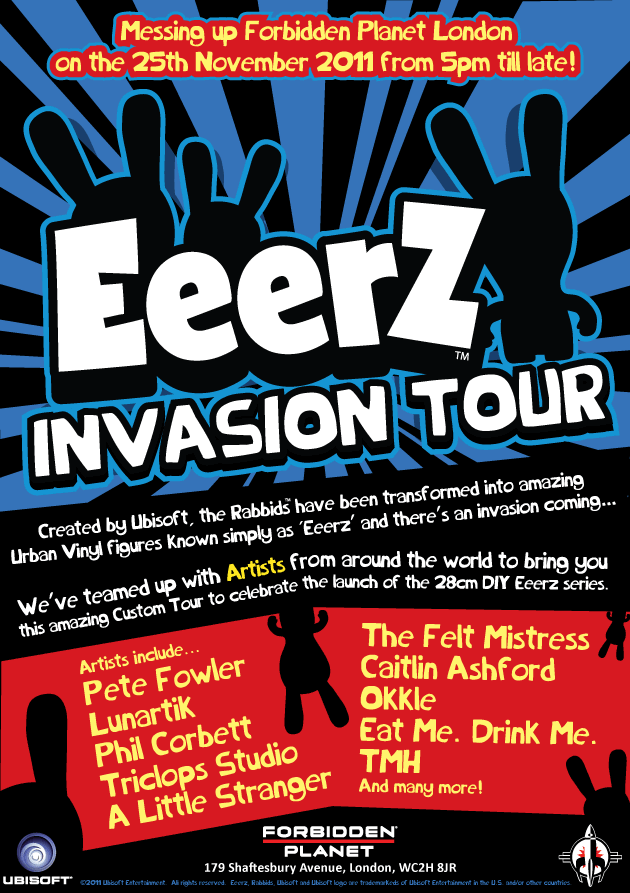 Visit Forbidden Planet in London on the 25th of November from 5pm until late, to see some crazy custom Eeerz on the first stop of the European Tour! See DIY Eeerz that have been transformed into works of art by renowned artists including Pete Fowler, Lunartik, The Felt Mistress, Phil Corbett and many more! You can also customise your own Eeerz in an art workshop by Lunartik, play the newly-released Raving Rabbids: Alive & Kicking and win cool prizes!