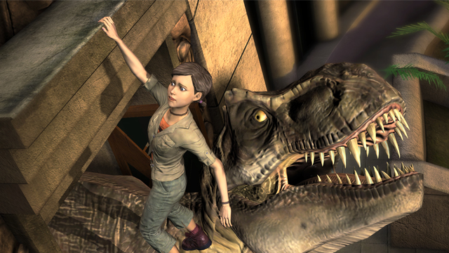 Perhaps another positive chalked up for the action based sequences is that you don’t have to listen to your characters forced moans and groans. Cocky-man Yoder has so many one liners it’s like he’s hankering for a sitcom. Mercenary Oscar mumbles all his dialogue in a peculiar accent that I can only describe as ‘Middle Earthish’, and Doctor Sorkin has such a backwards thinking activist approach for all the dinosaurs that you just want to shoot her and manufacture burgers from her corpse as bait so that she’s actually useful for something. Although the game focuses on an entire ensemble rather than one main character, park vet Gerry stands out as protagonist as he a) takes up the most screen time and b) is the least annoying. Gerry certainly does deserve props as some kind of super-dad, however, as if I had a daughter as ignorant as Jess weighing me down, I’m not sure I’d have the patience to carry her to rescue. Jess is a teenager who seems to have acquired all her habits from petty extras in 70’s teen horror flicks. She sounds like she’s constantly battling puberty with no clear winner in sight. Every third word is ‘Cool’ or ‘Awesome’, even if she just picks a scab without making it bleed, it’s something of an achievement to Jess. She’s keen to remind everyone that she’s an avid shoplifter in a desperate and slightly bizarrely characteristic plea for narrative context. Even her screams from the gullet of a T-Rex echo in mediocrity, as if her final thought was an optimistic one seeing as she’d never seen a dinosaurs’ bowel before. Had I purchased this sporadically and had to lie in wait for latter episodes, I’d only stumble into future instalments to justify the price I paid rather that return in eagerness for the next turn of events. It’s a shame that the brain-dead team don’t have any compelling voices in them, as they actually look fairly impressive. The characters have well-rendered facial features that are a step above those of Back To The Future: The Game’s, contributing to the park’s more serious undertones of survival. Unfortunately, it can sometimes be hard to recognise what’s a wrinkle on their panicked faces and what’s horrid screen tear. There are some ghastly technical errors here, from visual hiccups to audio screw-ups where dialogue will dip momentarily before blasting forth once again, this is certainly not the smoothest game you’ll play. Although these aren’t probing enough for the patient whilst watching the cut-scenes, they are certainly not welcome when running for your life. Mainly because your nerves are already dazed, but also because freezing can muck up commands and lead to some rather unfair messy deaths.